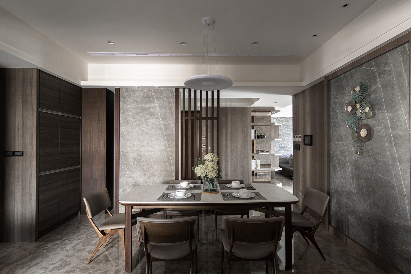 The overall spatial use enriches the stable stone plates. The metal line structures connect with each other, giving the simple and generous modern contour with delicate eastern essence. It fully manifests the harmonious beauty with the modern atmosphere, without any major modification in the spatial layout. The original storage space placed at a side of the hallway and the neighboring rooms are combined to become the changing room. At one side of the living room, another storage space is installed to complete the arrangement of the layout. It allows the overall layout to become more functional, smooth, and neat.